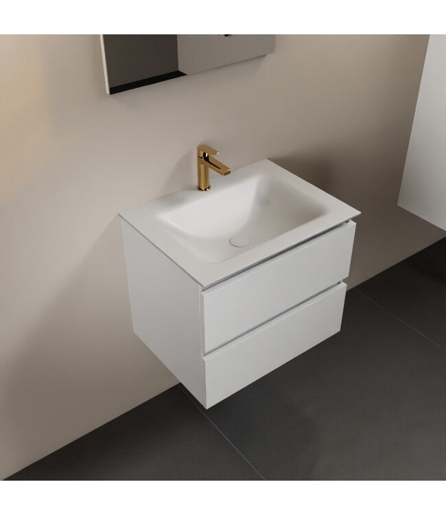De bijbehorende wastafel van Solid Surface in mat wit heeft een centraal geplaatste spoelbak met één kraangat. Dankzij het minimalistische design en de hoogwaardige materialen is dit badmeubel niet alleen een blikvanger, maar ook duurzaam en onderhoudsvriendelijk. Ideaal voor wie een strakke en georganiseerde badkamer wil creëren.