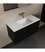 De bijpassende wastafel is gemaakt van duurzaam Solid Surface en heeft een antibacteriële coating. Met een breedte van 101 cm en een geïntegreerde spoelbak in het midden is dit wastafelmeubel perfect voor dagelijks gebruik. Dankzij het kraangatloze ontwerp kun je kiezen voor een wand- of opbouwkraan.