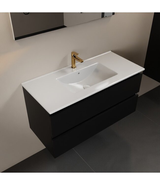 De centraal geplaatste wastafel met een breedte van 101 cm beschikt over één spoelbak en een kraangat, perfect afgestemd op uw wensen. Dankzij het antibacteriële keramiek is hygiëne gegarandeerd. Daarnaast is maatwerk mogelijk, zodat u het meubel naar uw eigen smaak kunt aanpassen. De perfecte keuze voor wie luxe en comfort in de badkamer wil combineren.