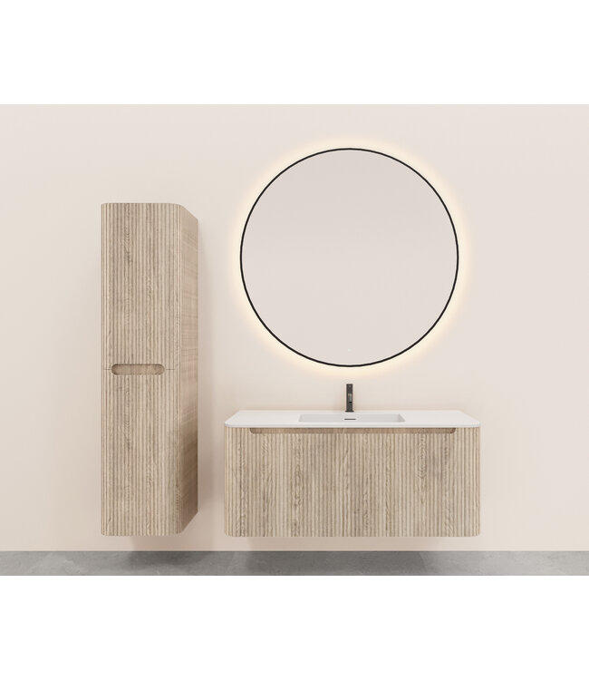 Creëer een oase van rust en luxe in je badkamer met de Sulora wastafelonderkast. Met zijn unieke verticale ribbelstructuur en verfijnde afgeronde hoeken is dit meubel dé eyecatcher voor wie houdt van een modern, Scandinavisch design.