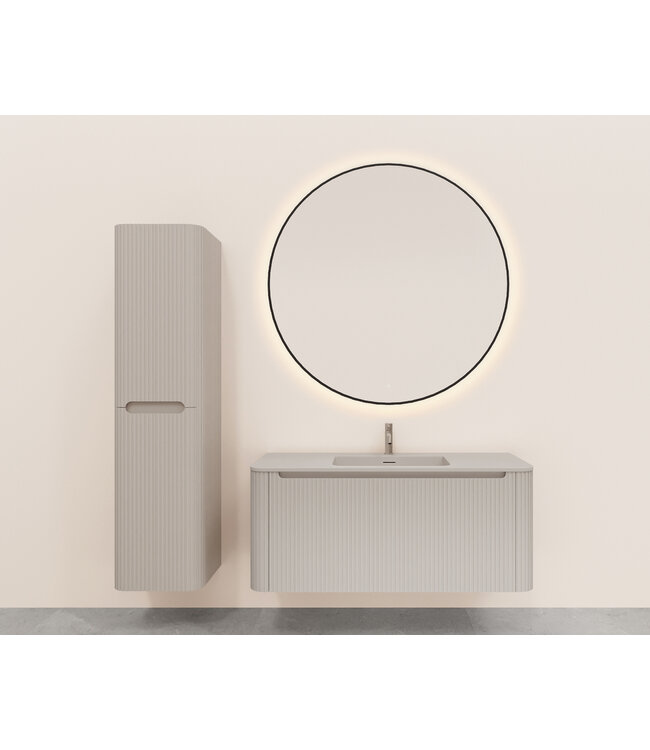 De Sulora onderkast is een absolute blikvanger voor de moderne badkamer. Het meest opvallende kenmerk is het elegante, verticale ribbeldesign op het front, wat zorgt voor textuur en diepte in je interieur. In combinatie met de zacht afgeronde hoeken krijgt de kast een vriendelijke, luxe en eigentijdse uitstraling die rust uitstraalt.