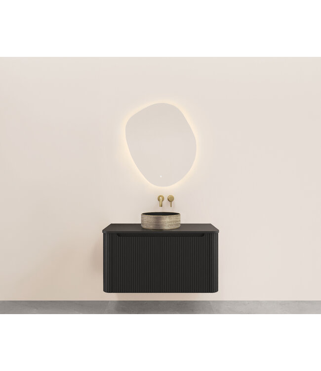 De Sulora wastafelonderkast is niet zomaar een meubel; het is een stijlvolle blikvanger die direct rust en luxe uitstraalt. Dankzij het elegante, verticale ribbeldesign en de zachte, afgeronde hoeken past dit meubel perfect in de hedendaagse badkamertrends. De diepzwarte, matte afwerking geeft een krachtig accent aan zowel lichte als industriële badkamerinterieurs.