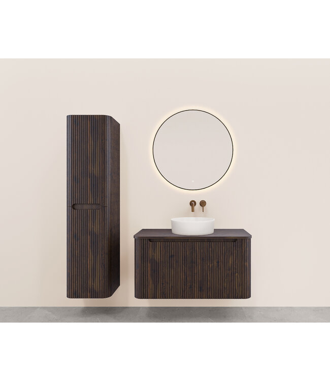 Breng warmte en textuur in je badkamer met de Onderkast Sulora. Deze wastafelonderkast is meer dan alleen een opbergmeubel; het is een designstuk. Het elegante, verticale ribbeldesign vormt een prachtig samenspel met de zacht afgeronde hoeken, waardoor de kast een luxe en eigentijdse uitstraling krijgt die perfect past in een moderne of Japandi-stijl badkamer.