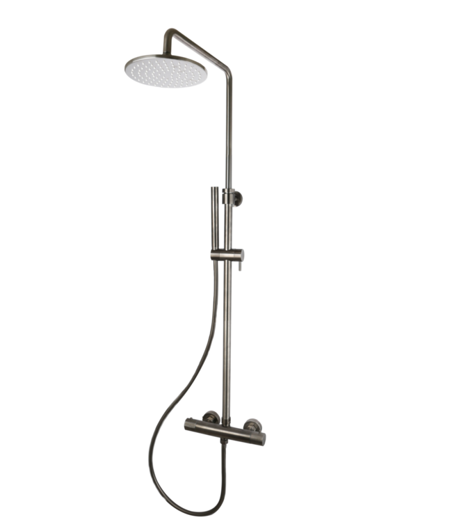 De Ribbed Gunmetal Regendoucheset combineert functionaliteit met elegantie. Het gunmetal afwerking voegt een vleugje verfijning toe aan je badkamer, terwijl de ronde grepen met ribbels een subtiele, maar gedenkwaardige touch bieden. De royale 30cm brede, ronde douchekop zorgt voor een weldadige stortdouche die elke keer weer een gevoel van luxe biedt. En voor extra gemak is de douchestang in hoogte verstelbaar (730 tot 1100 mm), waardoor deze perfect aan te passen is aan jouw behoeften.