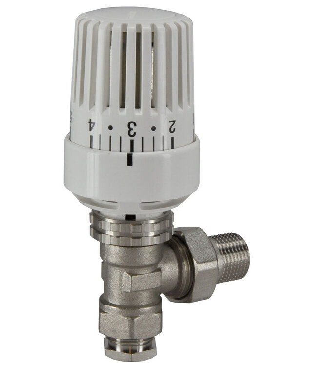 Thermostatisch radiatorventiel 1/2"x15mm haaksinclusief thermostaatknop en knelsetje 1/2"x15mm. Verpakt in full-color doosje , de kraan heeft een beschermkapje, waarmee deze afgesloten kan worden