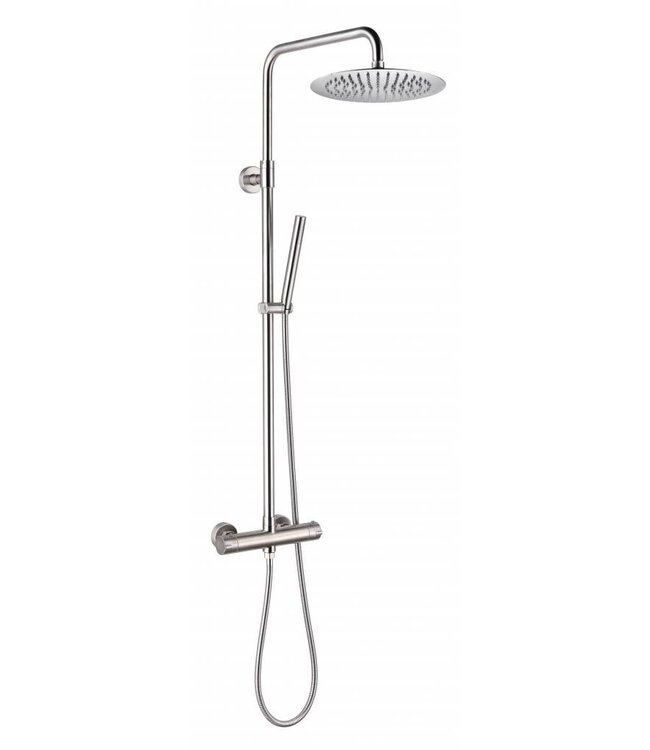 Doucheset Giulietta Opbouw RVS met Thermostaatkraan is voorzien van een handige thermostaatkraan, om eenvoudig de gewenste temperatuur in te stellen.De stortdouche is voorzien van een thermostatische mengkraan. Aan de ene zijde van de kraan wordt de temperatuur geregeld. Hier zit een beveiligde functie op 38 graden. Aan de andere zijde bepaald u welke functie aan moet en hoe hard de straal mag zijn. Draait u de knop naar achter, gaat de hoofddouche aan. Draait u de knop naar voren, dan gaat de handdouche aan.