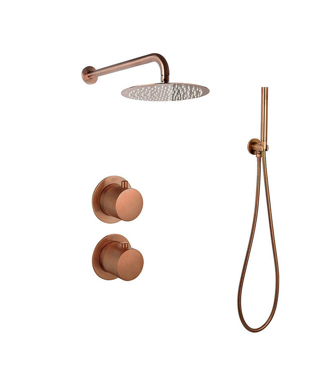 Het middelpunt van deze set is de indrukwekkende 25cm stortdouche, die je onderdompelt in een zachte, regenachtige nevel. Het mat koperen brons voegt een vleugje elegantie toe aan je badkamerinrichting. De gebribbelde knoppen op de thermostaatkraan en de omstelknoppen voegen niet alleen een tastbare dimensie toe aan het ontwerp, maar bieden ook uitstekende grip en precisie.