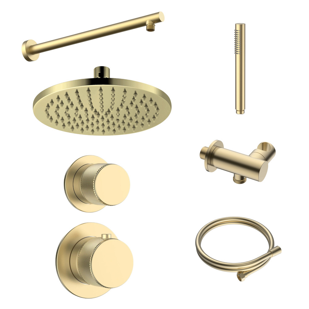 Compleet met inbouw thermostaat en Regendouche 30cm ✓ Geborsteld Messing / Goud ✓ Compleet met alle toebehoren ✓ Luxe ronde knoppen ✓ RVS materiaal ✓ Beschikbaar in 6 kleuren