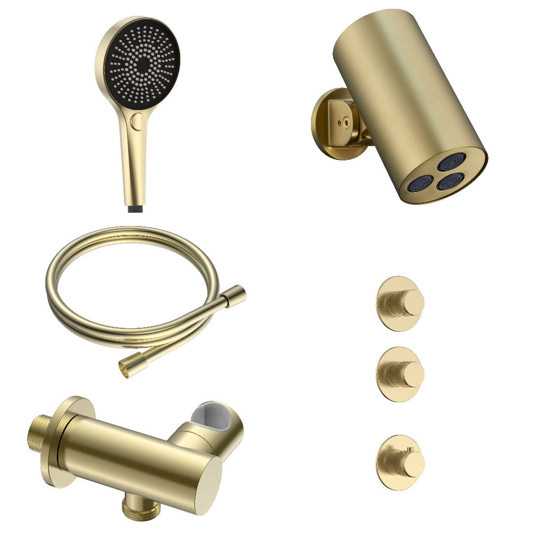 Geef jouw badkamer een luxueuze, hotelwaardige upgrade met de Stria Cilinder 2-weg Inbouw Regendoucheset in Geborsteld Goud. Deze premium inbouw doucheset – ook bekend als inbouw douchecombinatie, geïntegreerd douchesysteem of ingebouwde regendouche – combineert tijdloze elegantie met ultiem comfort. De verfijnde cilindervormen, naadloze inbouwinstallatie en warme goudtint zorgen voor een exclusieve, spa-achtige uitstraling die moeiteloos aansluit bij moderne, chique en high-end interieurs.