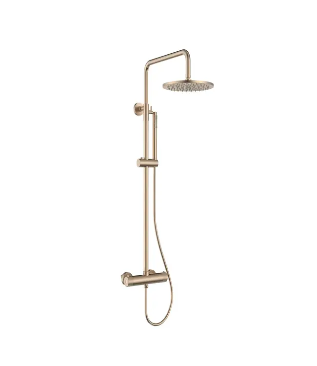 Geef je badkamer een luxueuze upgrade met de Regendoucheset Opbouw Grip Geborsteld Brons Koper 30cm hoofddouche van DutchLine. Deze stijlvolle opbouw regendouche set is ontworpen voor wie houdt van verfijnde details en een premium douchebeleving. Het geborsteld brons koperen profiel straalt warmte en elegantie uit, terwijl het robuuste RVS zorgt voor duurzaamheid en een lange levensduur.
