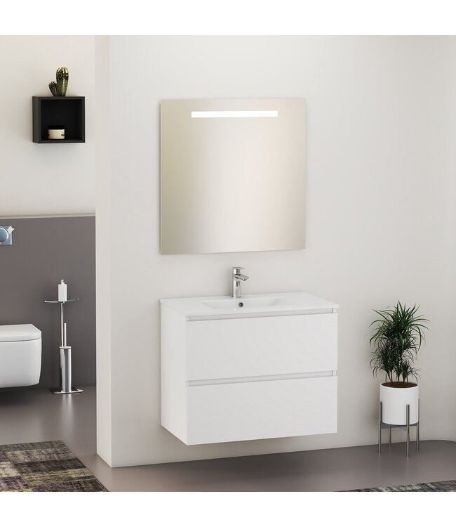 Het badkamermeubel is ontworpen met een strakke mat witte afwerking die moeiteloos in verschillende badkamerstijlen past. De onderkast heeft een afmeting van 80x46x60 cm en biedt voldoende opbergruimte dankzij de twee lades met softclose geleidesysteem. Hierdoor openen en sluiten de lades geruisloos en soepel.