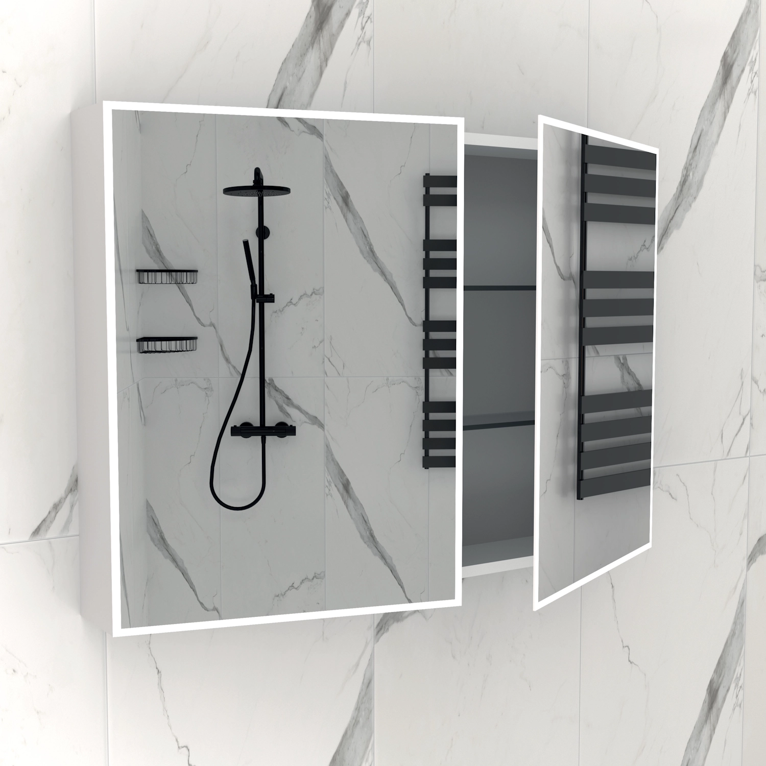 De spiegelkast is volledig uitgevoerd in hoogwaardig aluminium: een licht, sterk en roestbestendig materiaal dat uitstekend bestand is tegen vocht en temperatuurverschillen in de badkamer. Het spiegelglas is A-klasse — de hoogste kwaliteit die beschikbaar is — wat zorgt voor een kristalhelder spiegelbeeld en lange levensduur.