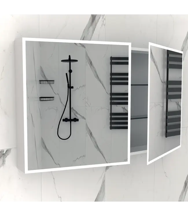 De spiegelkast is vervaardigd uit hoogwaardig aluminium, een sterk maar licht materiaal dat uitstekend bestand is tegen vocht en temperatuurschommelingen in de badkamer. Het spiegelglas is van A-klasse kwaliteit — de hoogste categorie in helderheid en duurzaamheid — waardoor u verzekerd bent van een perfect spiegelbeeld.