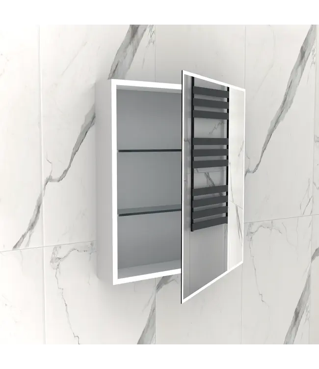 De constructie van de spiegelkast is volledig uitgevoerd in aluminium. Dit materiaal is licht, sterk en uitzonderlijk goed bestand tegen vocht en temperatuurwisselingen in de badkamer. Het spiegelglas is van A-klasse kwaliteit – de hoogste glasstandaard die beschikbaar is – voor een scherpe reflectie en maximale duurzaamheid.