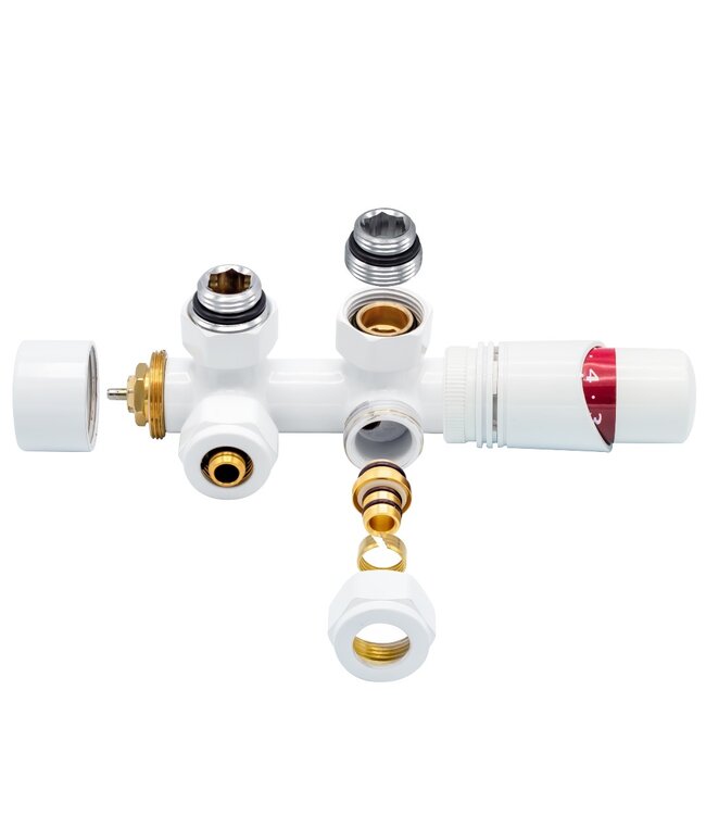 Deze radiatorkraan plaats je wanneer je CV-buis uit de muurkomt. Het voordeel van een thermostatische radiatorkraan is de automatische regeling van de temperatuur van de radiator.