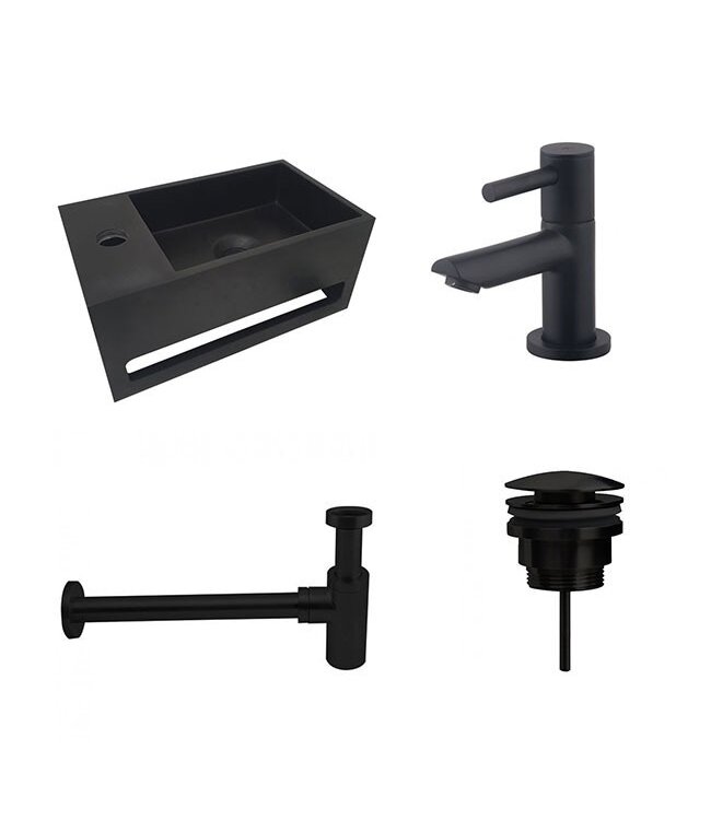 De moderne en praktische Fonteinset Sima Solid Surface Links is mat zwart. Mat zwarte elementen zijn helemaal in voor de toiletruimte of badkamer. Mat zwart zorgt voor een unieke uitstraling in uw toiletruimte of badkamer. Zo kunt u een mooi geheel creëren in uw badkamer of toiletruimte door ook gebruik te maken van mat zwarte accessoires zoals een mat zwarte WC borstel en een mat zwarte zeepdispenser. Daarnaast is de mat zwarte toiletset niet alleen mooi maar blijft het ook jarenlang mooi dankzij het duurzame en sterke Solid Surface materiaal.