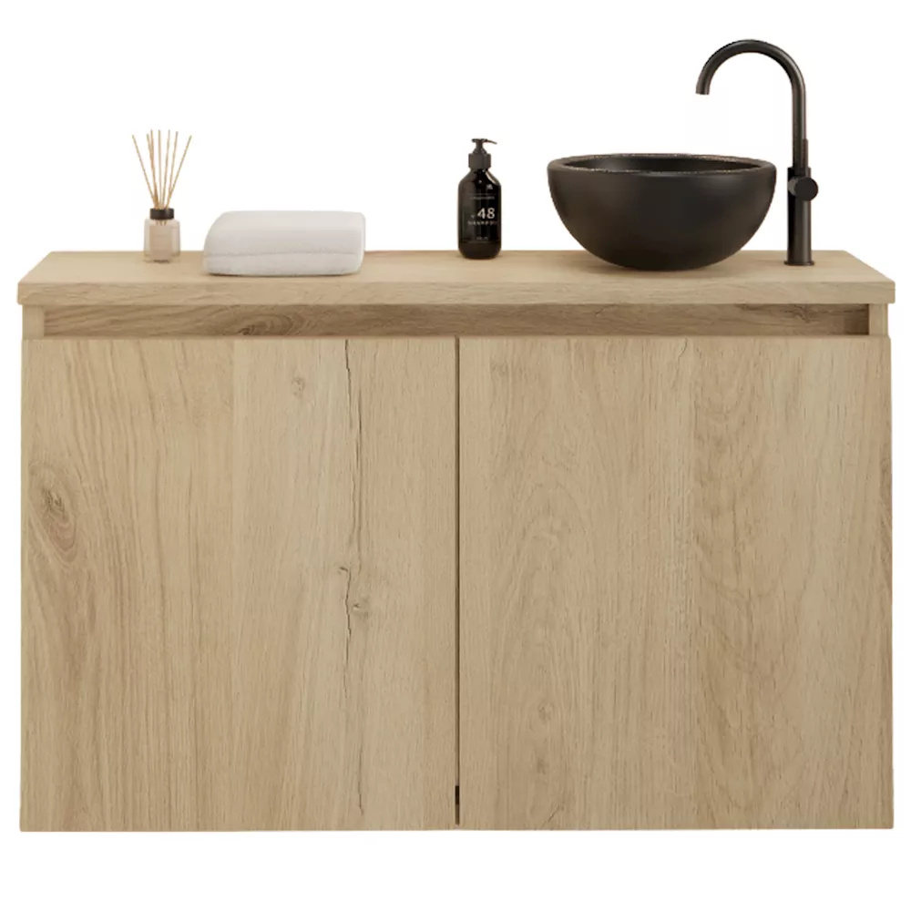 Het bijgeleverde witte toppaneel zorgt voor een fris contrast met de warme houttint en maakt het meubel compleet. Wil je liever een andere stijl? Combineer de onderkast eenvoudig met een zwart of eiken topblad voor een persoonlijk accent.