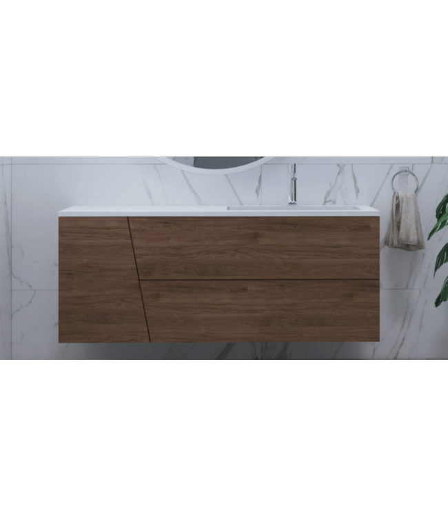 De Treez Badkamermeubel 140 cm Oak Cognac met wastafel heeft een strak uitziende wasbak aan de rechterkant. De onderkasten van Treez serie zijn in twee kleuren (Oak Classic en Oak Cognac) verkrijgbaar. Beide kleuren hebben een 120 en een 140cm uitvoering. Deze kunt u vervolgens met een glans witte of mat witte wastafel combineren. Naar wens kunt u kiezen voor een kraangat of zonder kraangat versie. Wilt u deze badmeubel onderkast liever met een topblad in dezelfde kleur? Belt of mailt u ons dan voor een offerte.