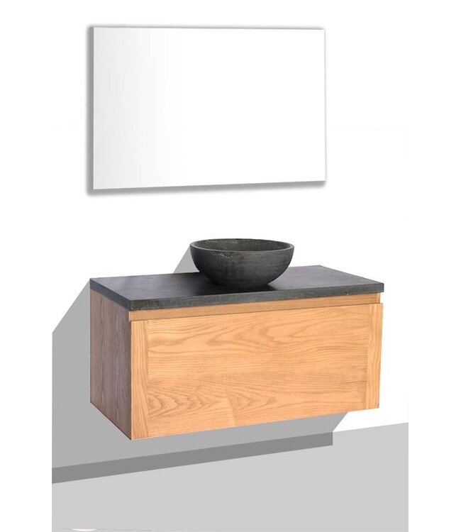 Deze bijzondere eiken badkamermeubelset bestaat uit een onderkast, een topblad, een waskom en een badkamerspiegel. De onderkast is gemaakt van massief eikenhout en beschikt over één soft-close lade. Deze badkamermeubel is leverbaar in drie verschillende afmetingen. 80cm, 100cm 120cm. (twee lades bij de 120 cm-variant) waarin u verschillende badkamerproducten kwijt kunt. Bovenop de kast wordt een topblad bevestigd die een hoogte van 3 cm heeft. Dit wastafelblad is antraciet van kleur en is gemaakt van hardsteen.