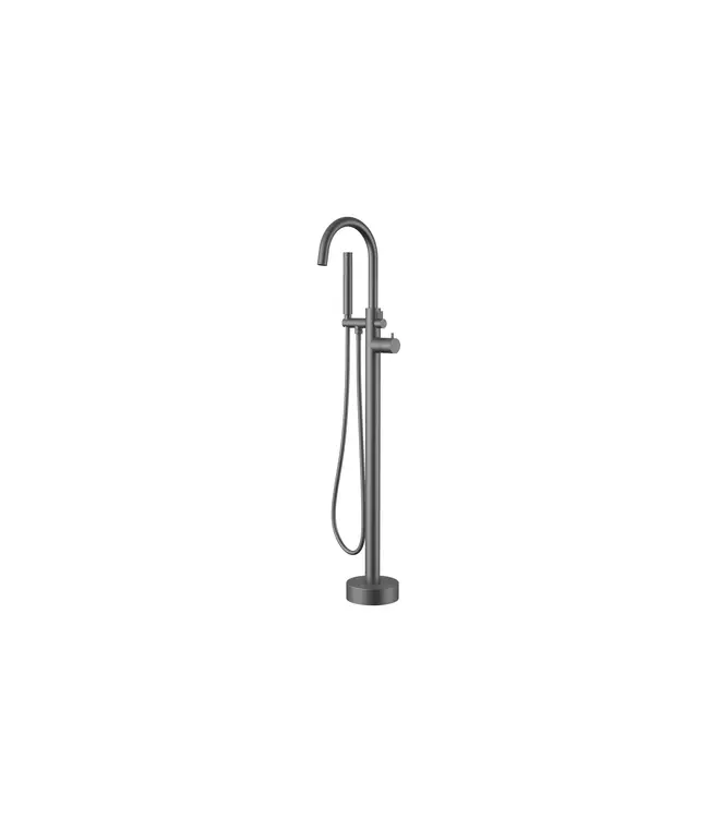 De elegante gunmetal afwerking maakt deze vrijstaande badkraan tot een stijlvolle eyecatcher in iedere badkamer. De meegeleverde handdouche met één straalstand en een ultra-flexibele PVC-slang zorgt voor maximale bewegingsvrijheid bij het in- en uit-stappen of afspoelen.
