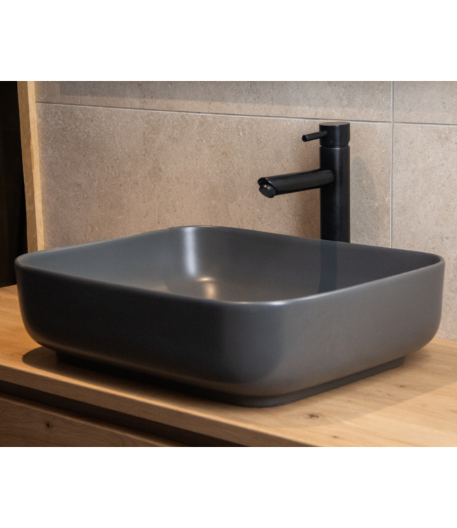 De donkere, matte antracietkleur geeft je badkamer een luxe en industriële uitstraling. Dankzij het strakke, vierkante design en de matte finish is deze waskom uitstekend te combineren met zwarte of chromen kranen en natuurlijke materialen zoals hout of beton. Ideaal voor plaatsing op een badkamermeubel of wastafelblad, en geschikt voor zowel opbouwkranen als wandkranen.