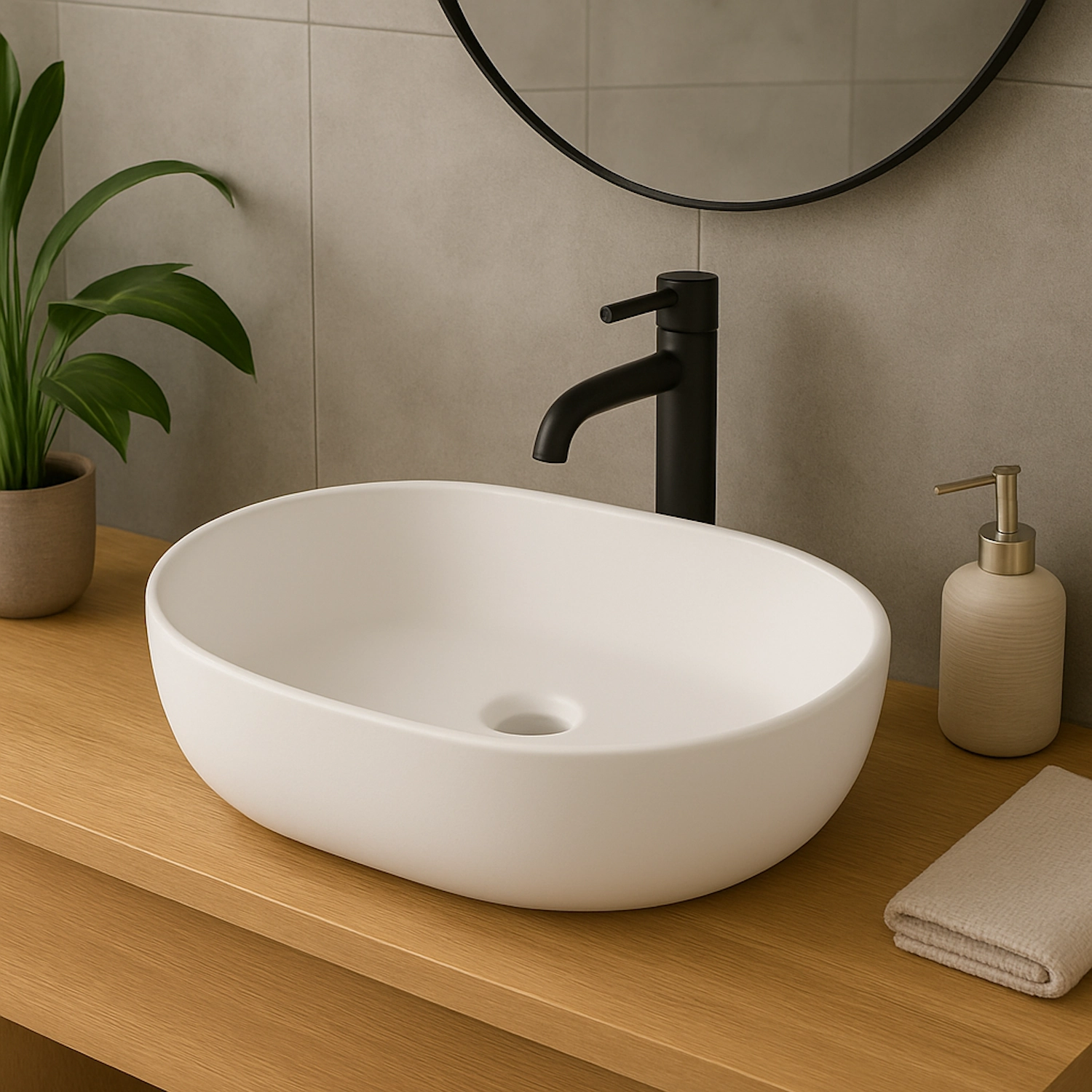 De ovale vorm en het royale formaat van 60x40x13 cm zorgen voor een luxueuze uitstraling én praktisch gebruiksgemak. Dankzij het ontbreken van een kraangat en overloop is dit model ideaal als opbouw wastafel op een topblad of vrijstaand badkamerblad. Zo past de waskom perfect bij moderne badkamermeubel waskommen.