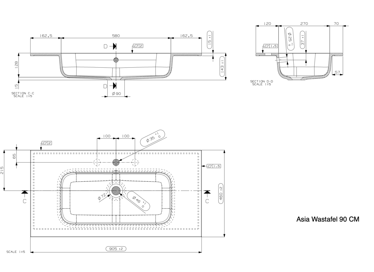 Wastafel Asia Mat Zwart 90cm wasbak zonder kraangat