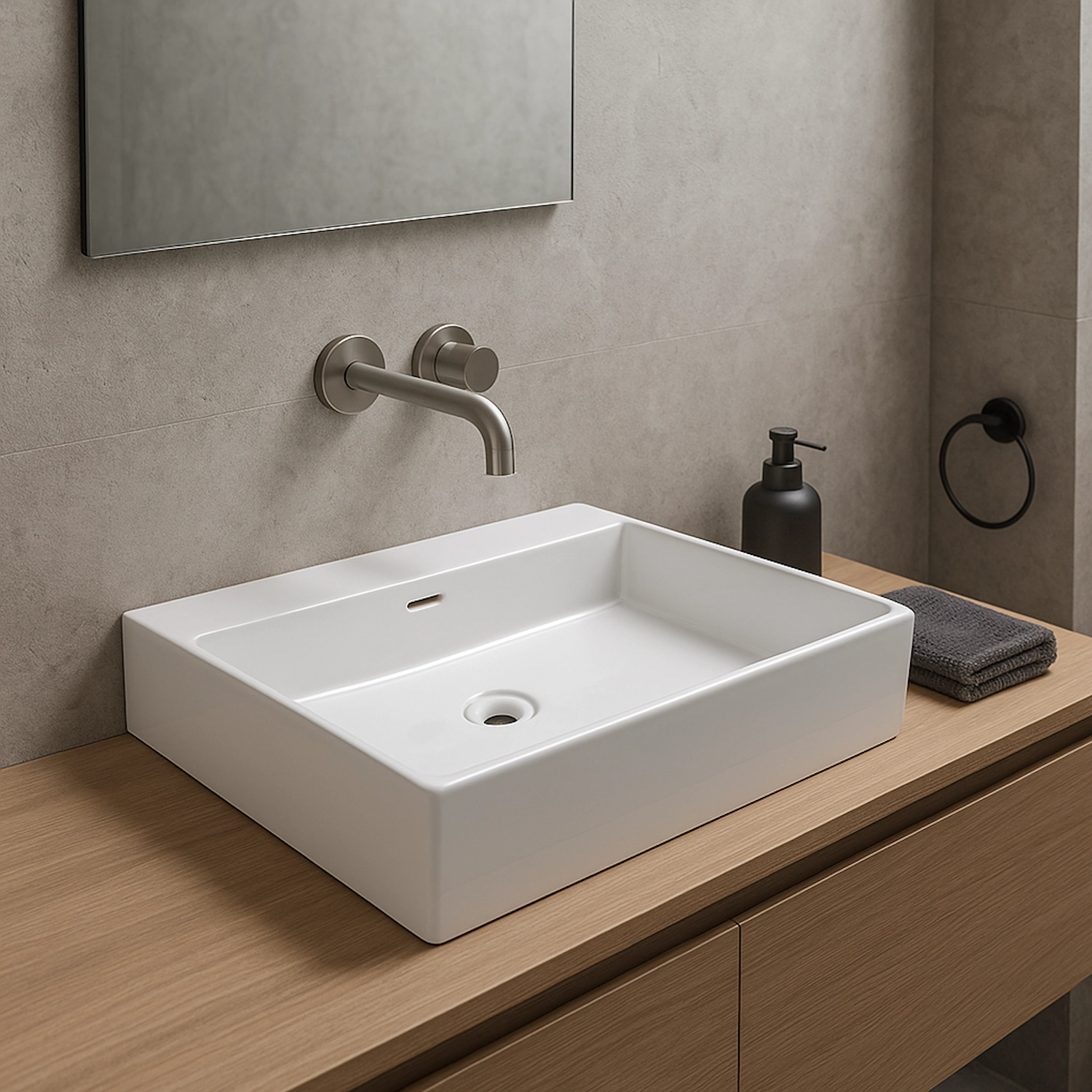 De Dutch Line Tight wastafel is niet vrij ophangbaar, maar ontworpen als opbouwmodel, geschikt voor plaatsing op een badkamermeubel of een blad. De luxe overloopuitsparing met kapje geeft de wasbak een verfijnde uitstraling én voorkomt overstroming.