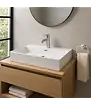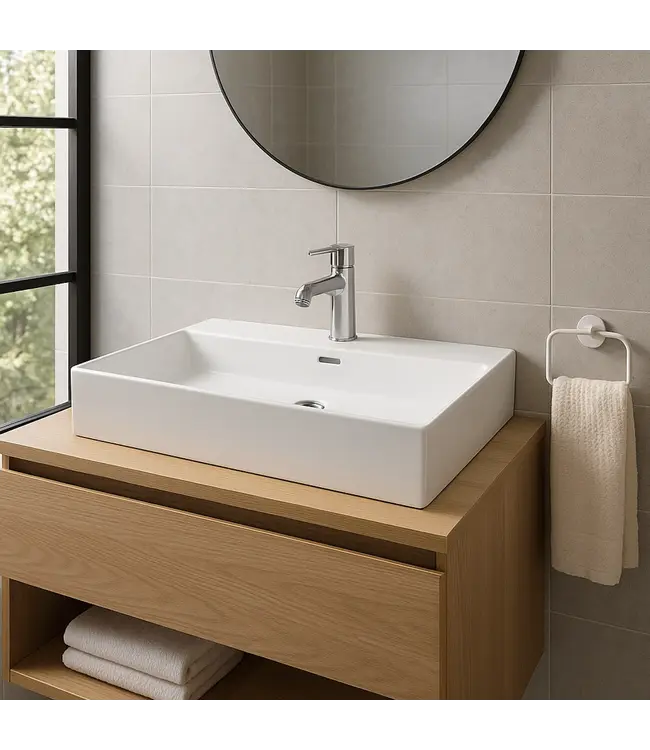Deze wasbak badkamer is ideaal voor plaatsing op een onderkast of badmeubelblad. Door zijn slimme formaat en moderne vormgeving past hij perfect bij diverse onderkasten uit ons assortiment, wat zorgt voor een naadloze afwerking van jouw wastafel badkamer – én dat voor een scherpe prijs.