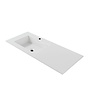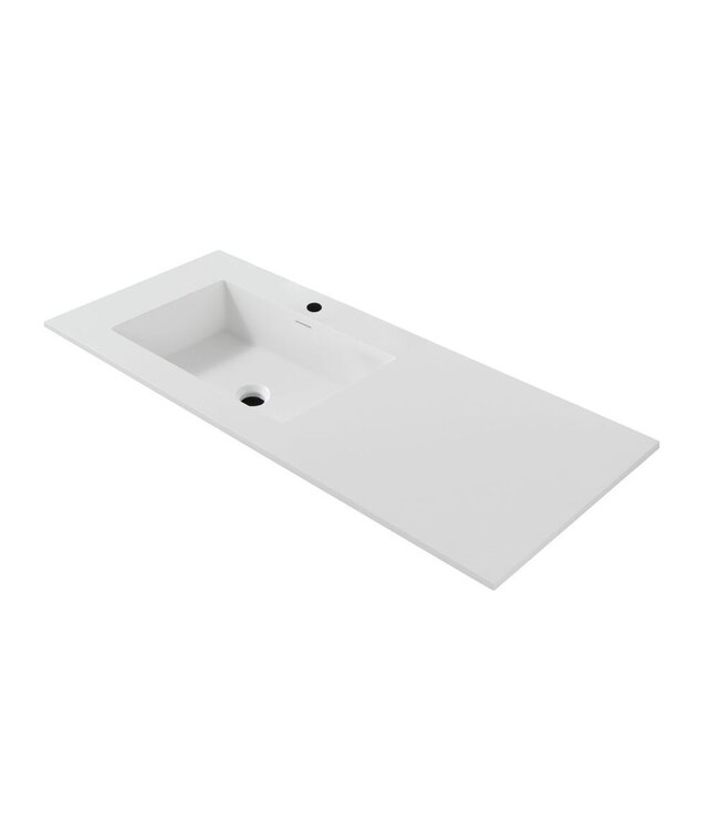 De Wonda wastafel is vervaardigd uit duurzaam kunstmarmer in een tijdloze mat witte afwerking. Dit zorgt voor een glad, hygiënisch oppervlak dat eenvoudig schoon te houden is. De enkele wasbak is subtiel geïntegreerd in het blad en voorzien van één kraangat en een handige overloop, wat zorgt voor veilig gebruik zonder wateroverlast.