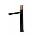 Wastafelkraan Hoog Quo Lux Mengkraan Zwart-Rose is 31,7cm hoog. De kraan heeft een uitloop dat 15,5cm lang is en een waterval van 22cm.