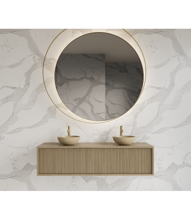 Het badkamermeubel is vervaardigd uit hoogwaardig fineer eiken, een materiaal dat niet alleen een luxe uitstraling geeft, maar ook bestand is tegen vocht en warmte. De ruimte tussen de verticale ribbels is donkerder, waardoor de elegante stijl van deze wastafelkast nog meer wordt benadrukt. De strak afgewerkte randen zorgen voor een naadloze afwerking die bijdraagt aan een verfijnde uitstraling.