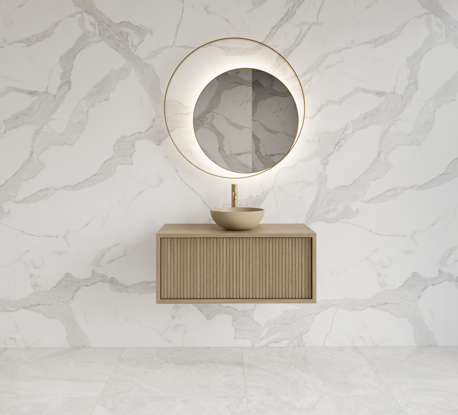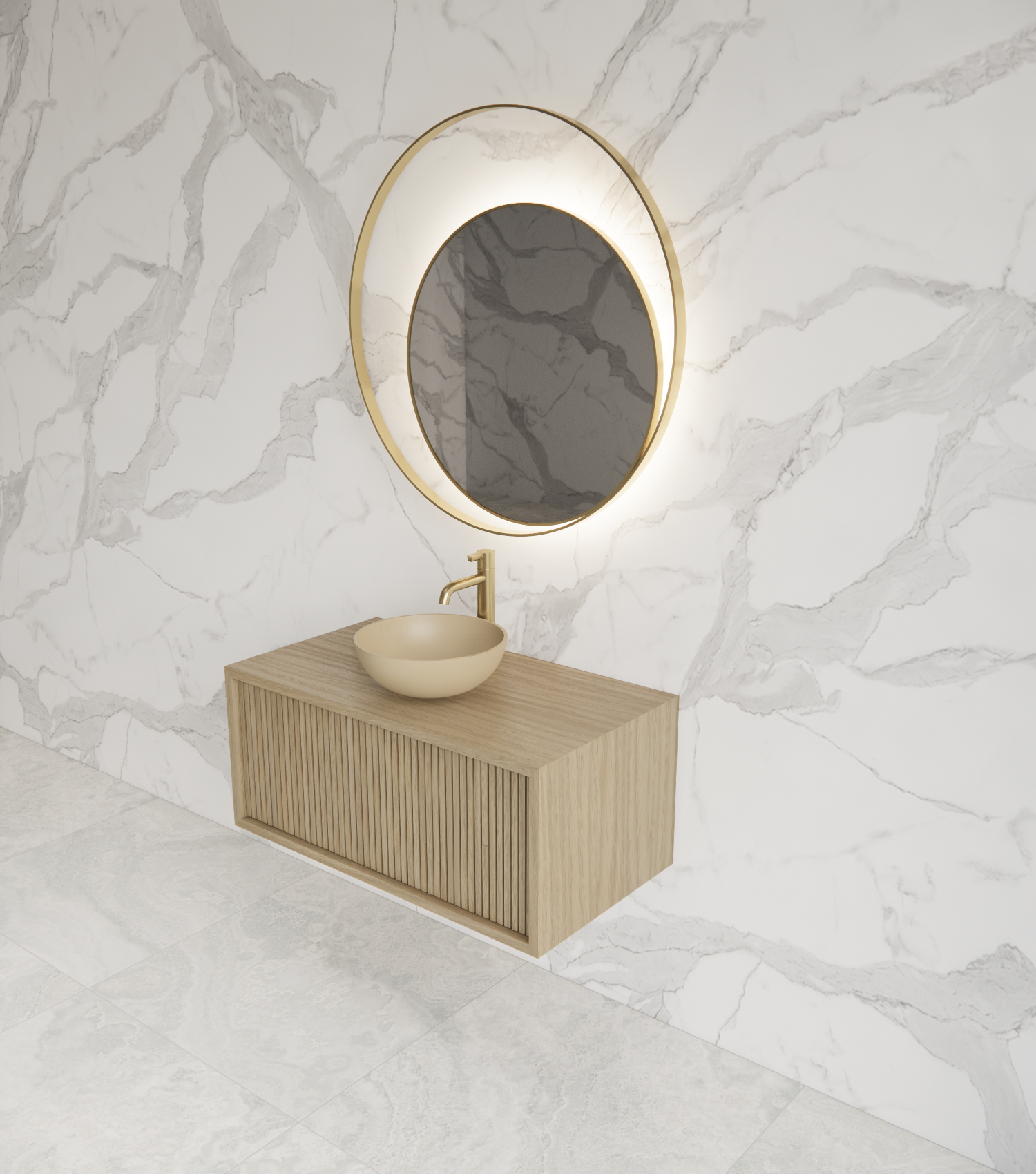 Het wastafelmeubel is vervaardigd uit Fineer Eiken, een materiaal dat niet alleen esthetisch aantrekkelijk is, maar ook beschermd is tegen de uitdagende omstandigheden in de badkamer. De warme kleur Corn Silk, gecombineerd met de donkere accenten tussen de verticale ribbels, benadrukt de elegante stijl van de wastafel onderkast.