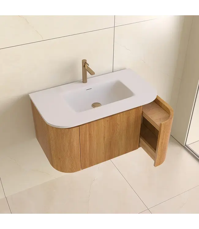 Met zijn zwevende ontwerp oogt dit badmeubel met Curve licht en modern, terwijl het ook de vloer vrijhoudt voor een ruimtelijk effect. De solid surface wastafel van 80 cm breed heeft een dun, strak paneel van slechts 1,2 cm dik. Het kraangat is optioneel, waardoor je de vrijheid hebt om een opbouw- of inbouwkraan te kiezen.