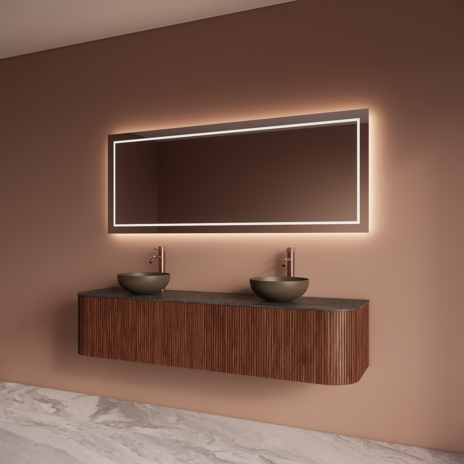 De onderkast is voorzien van een elegante ribbelstructuur met een verfijnde curve aan de zijkanten – een uniek designelement dat rust en ritme brengt in elke badkamer. De warme walnootkleurige afwerking, gecombineerd met een opvallend topblad naar keuze in wit marmerlook of zwart leisteenlook, creëert een harmonieus contrast van natuur en luxe.