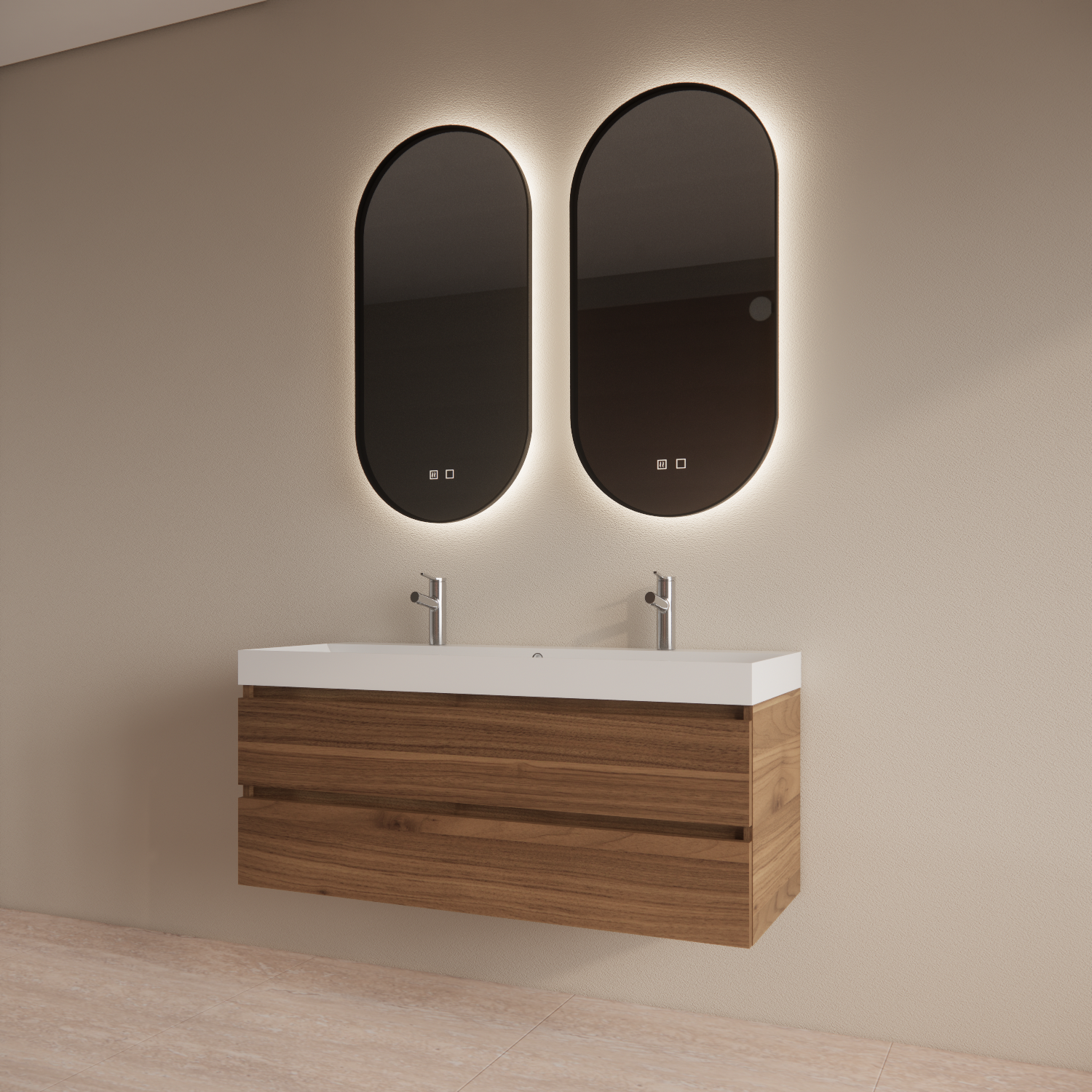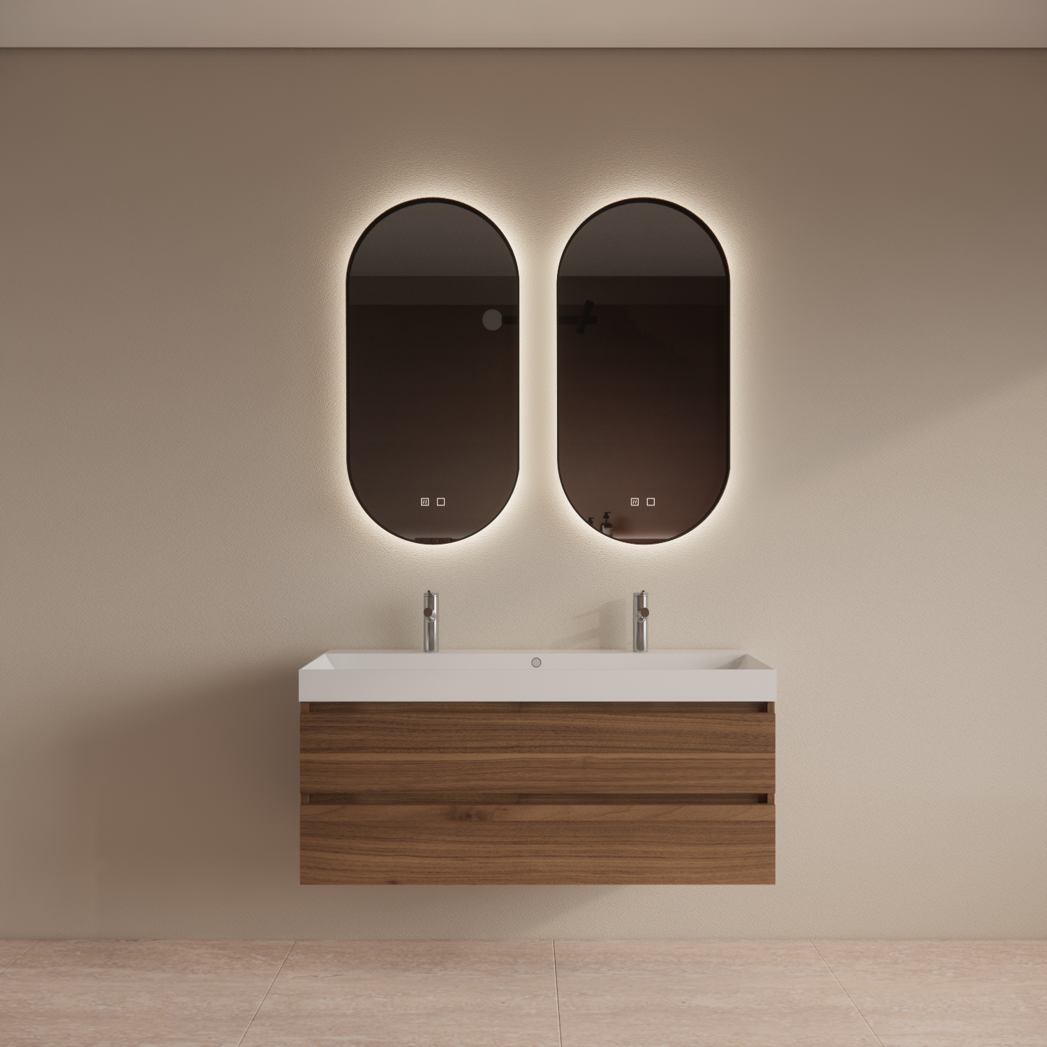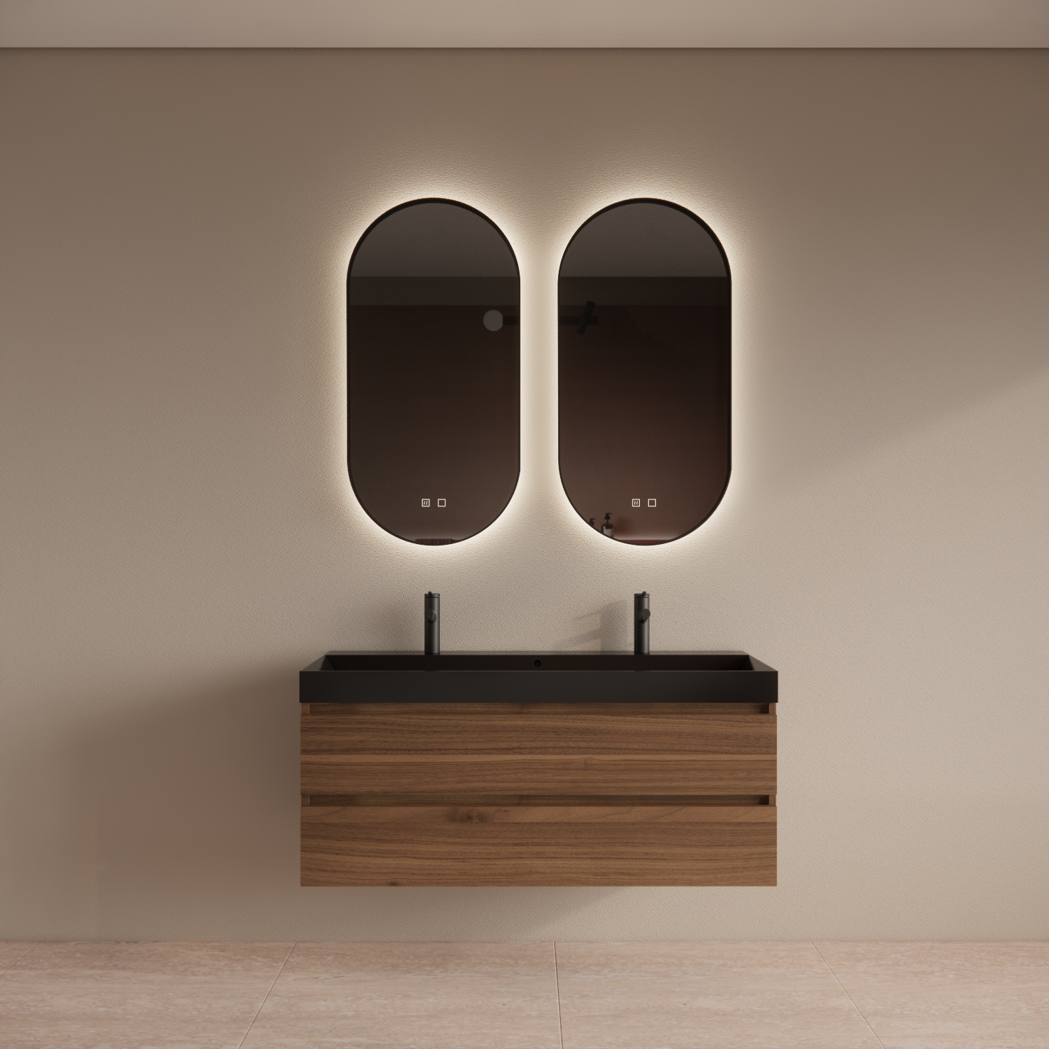 Installatieadvies: Deze onderkast badmeubel wordt geleverd zonder sifonuitsparingen. Dat biedt meer vrijheid in het kiezen van een bijpassende sifon en wastafel. De combinatie met een wastafel met of zonder kraangat biedt extra flexibiliteit in ontwerp. Liever een topblad in dezelfde walnootkleur? Neem contact op via e-mail – wij helpen je graag verder.