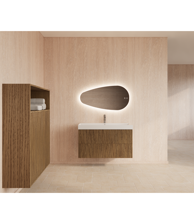 Deze onderkast badmeubel is vervaardigd van hoogwaardig fineer eiken en voorzien van twee ruime lades met een luxe push&pull systeem. De verticale ribbels geven de kast een retro look en creëren een prachtig diepte-effect. Dankzij de donkere ruimte tussen de ribbels wordt de stijlvolle uitstraling nog eens extra benadrukt.