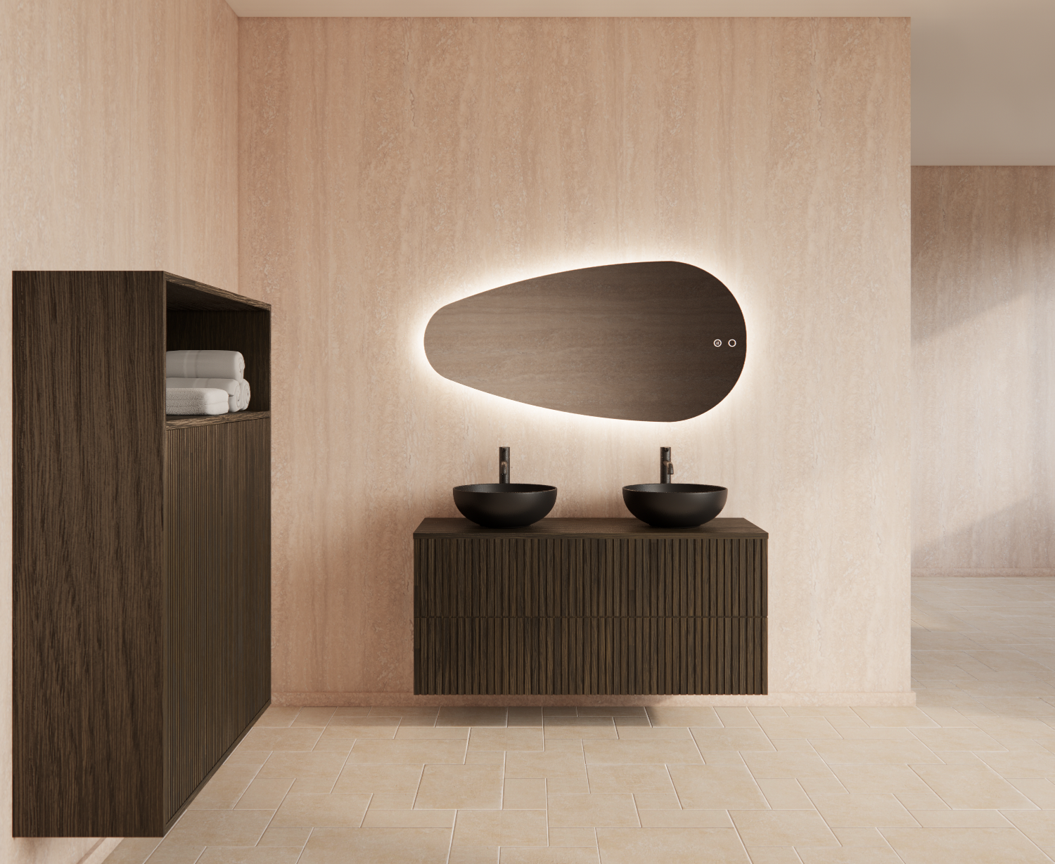 Met een breedte van 120cm biedt deze wastafelonderkast voldoende opbergruimte voor al je badkamerbenodigdheden. De donkere ruimte tussen de ribbels benadrukt de stijlvolle uitstraling van de kast en zorgt voor een speels effect. Naast de 120cm variant zijn er ook wastafelonderkasten beschikbaar in de maten 140, 160, 180 en 200cm. Neem contact met ons op voor meer informatie over de verschillende mogelijkheden.