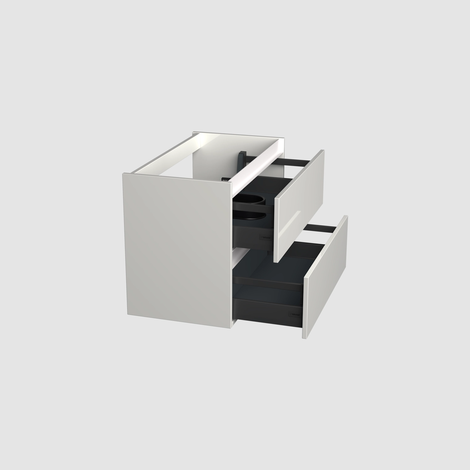 De Lepor wastafelonderkast is uitgerust met twee ruime softclose lades die geruisloos sluiten, zelfs bij sneller gebruik. Geen geklapper, geen slijtage door impact – alleen soepel en comfortabel gebruiksgemak. De strakke greeploze voorkant versterkt de minimalistische look en maakt schoonmaken extra eenvoudig.