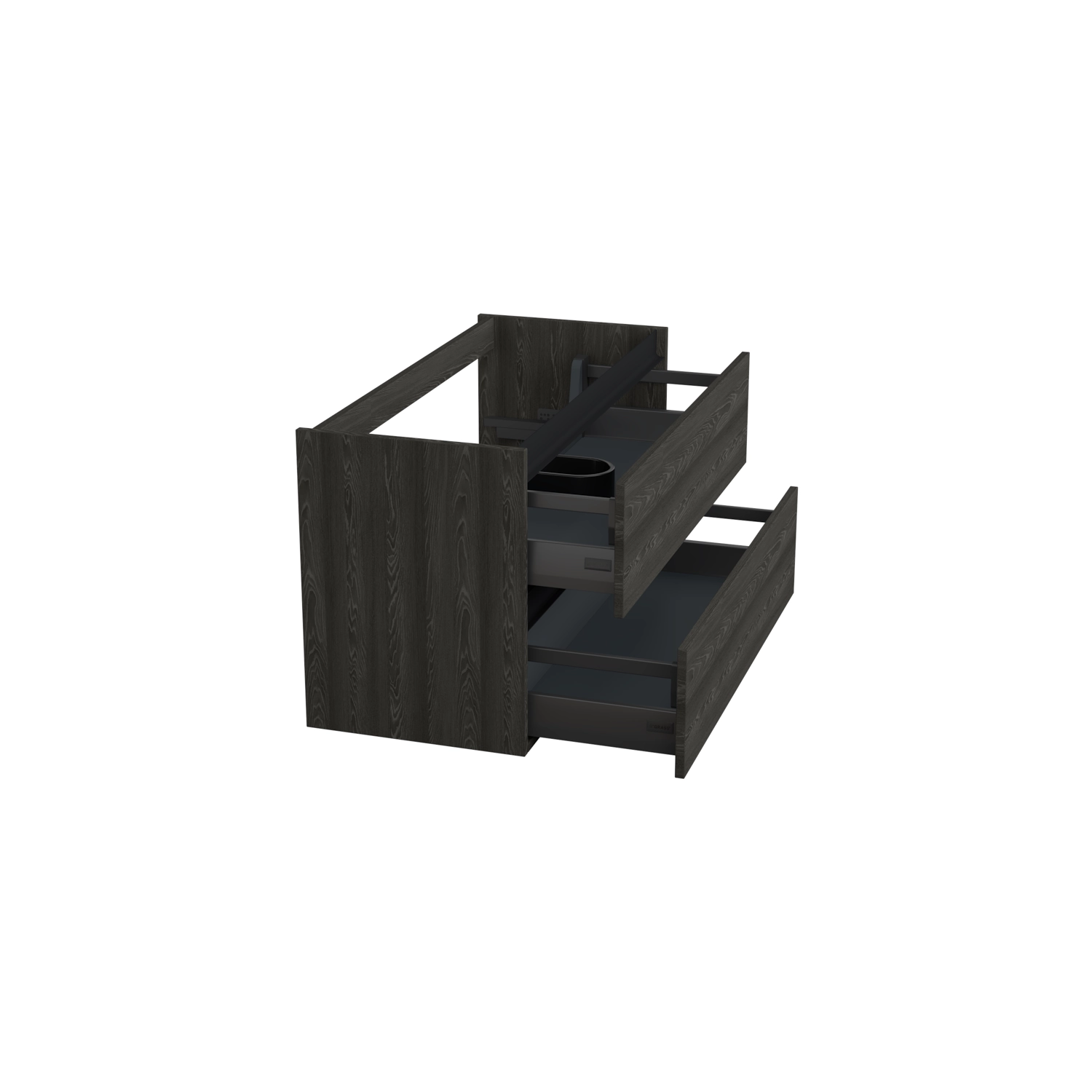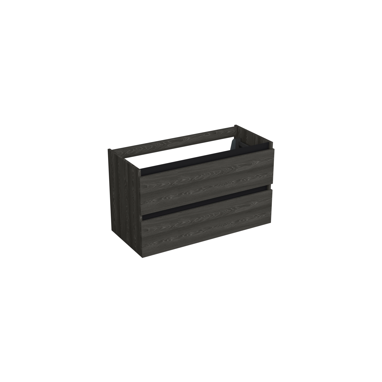 ✓ Onderkast 99 x 45 x 58 cm ❌ Excl. Wastafel ✓ Kleur: Zwart Eiken ✓ Twee diepe Modern, greeploos lades met sifon uitsparing ✓ MDF met FSC-keurmerk ✓ Installatie: Voorgemonteerd