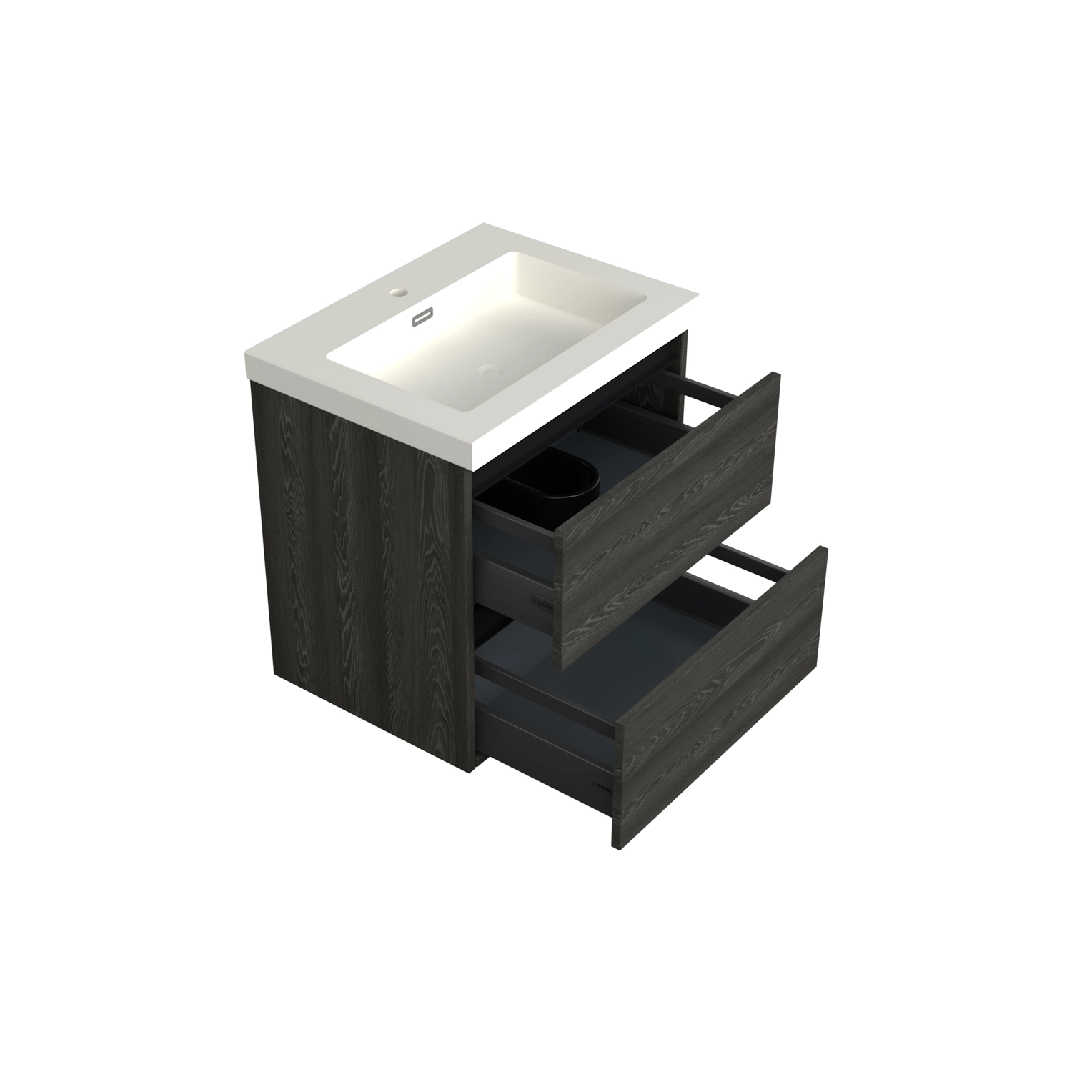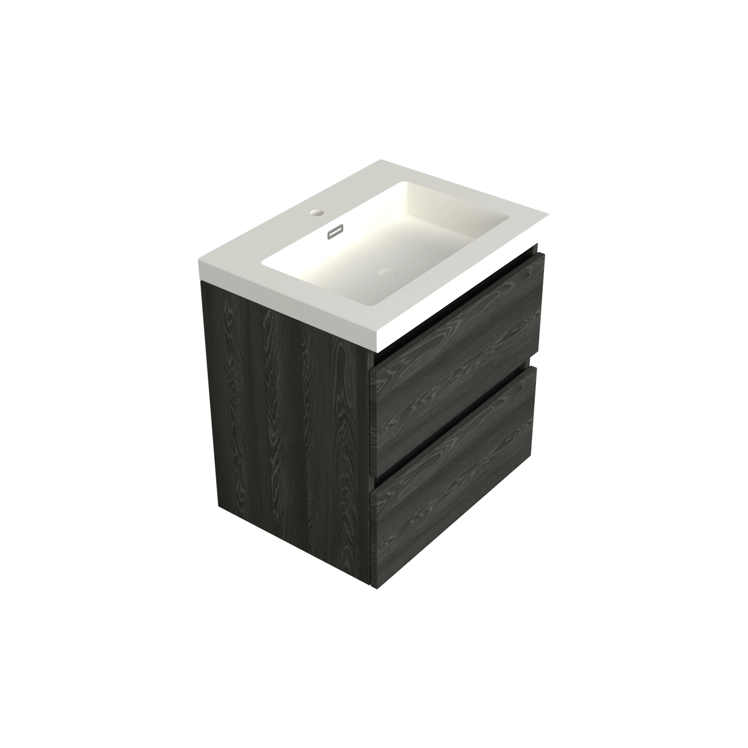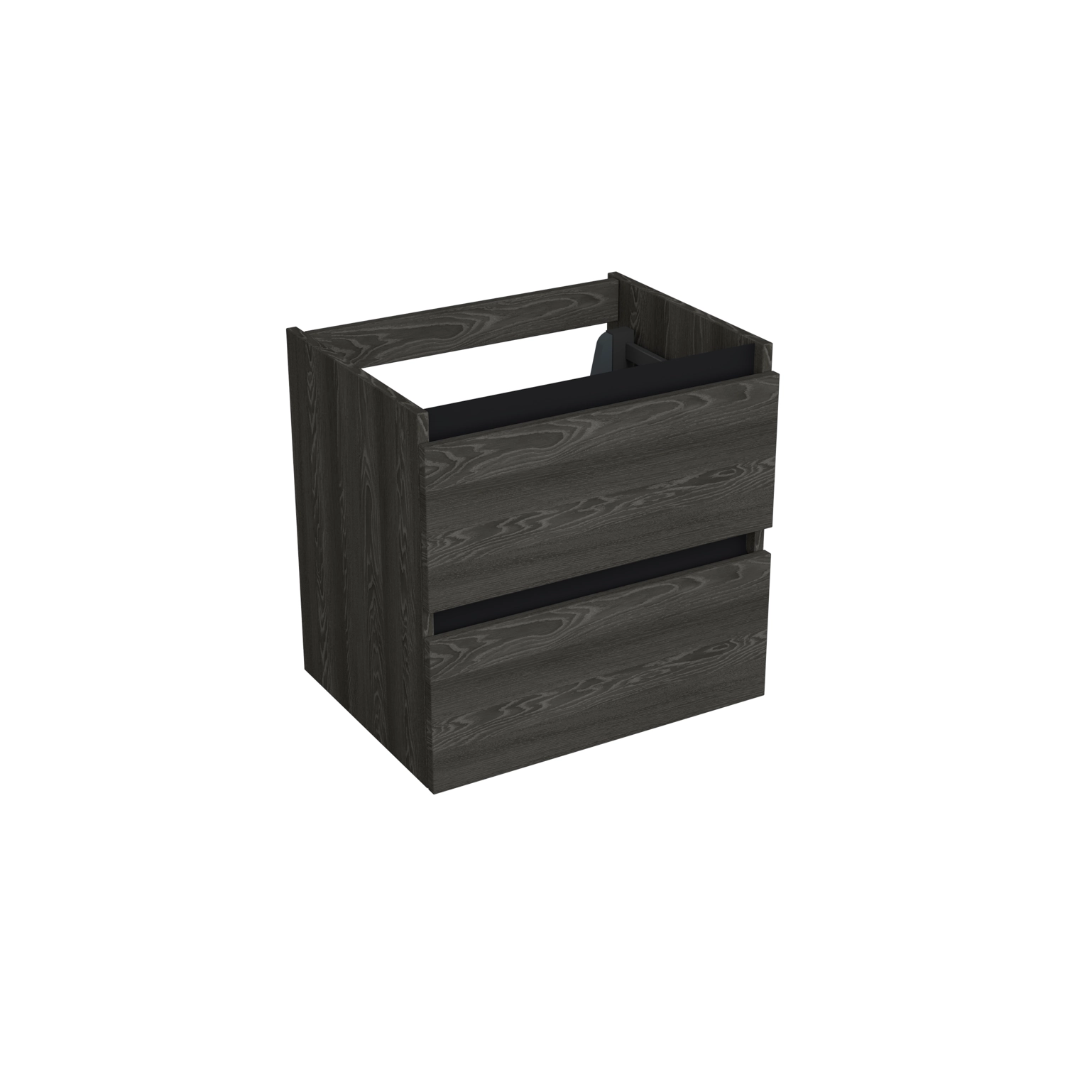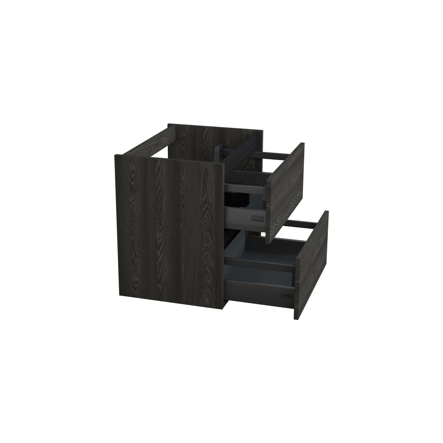 ✓ Onderkast 59 x 45 x 58 cm ❌ Excl. Wastafel ✓ Kleur: Zwart Eiken ✓ Twee diepe Modern, greeploos lades met sifon uitsparing ✓ MDF met FSC-keurmerk ✓ Installatie: Voorgemonteerd