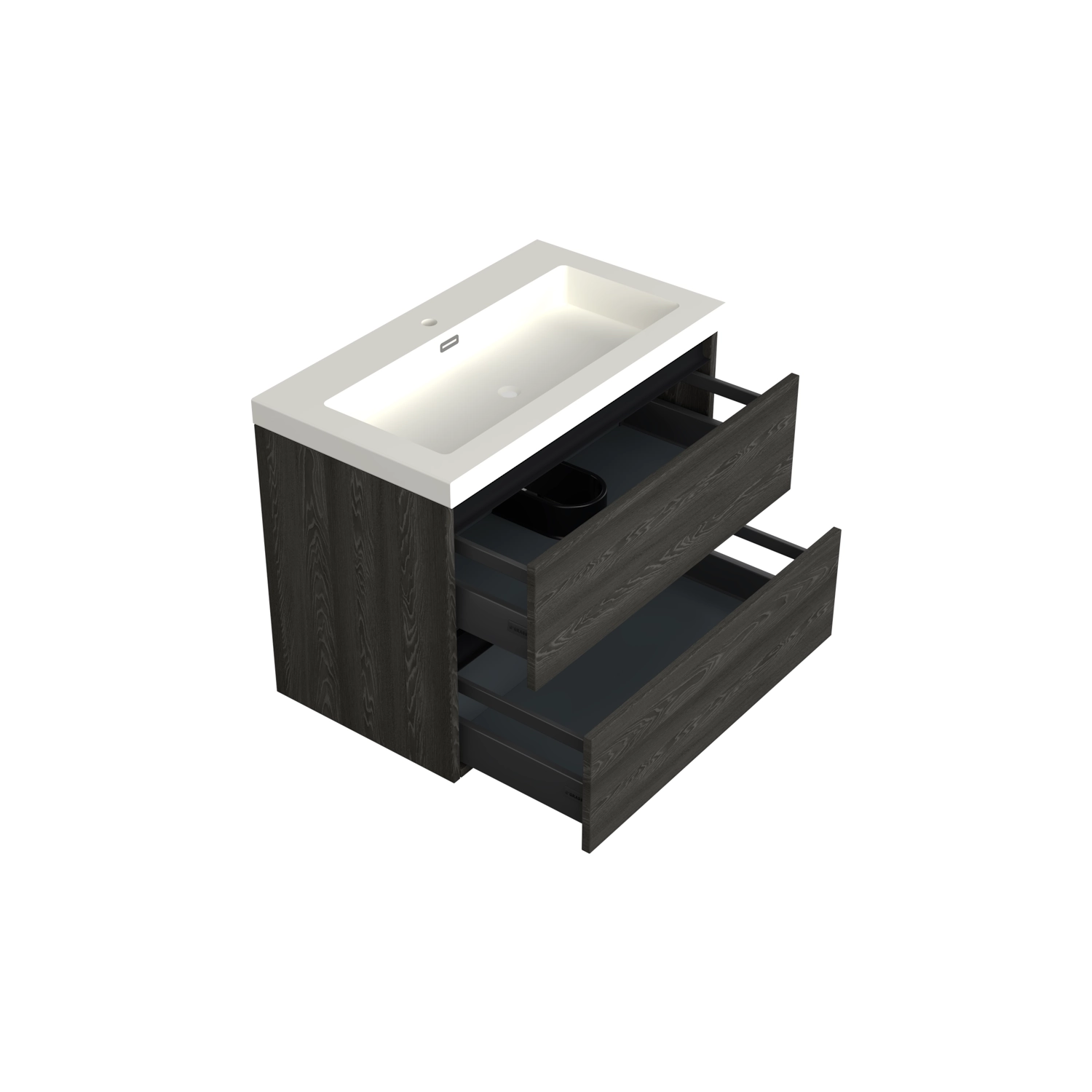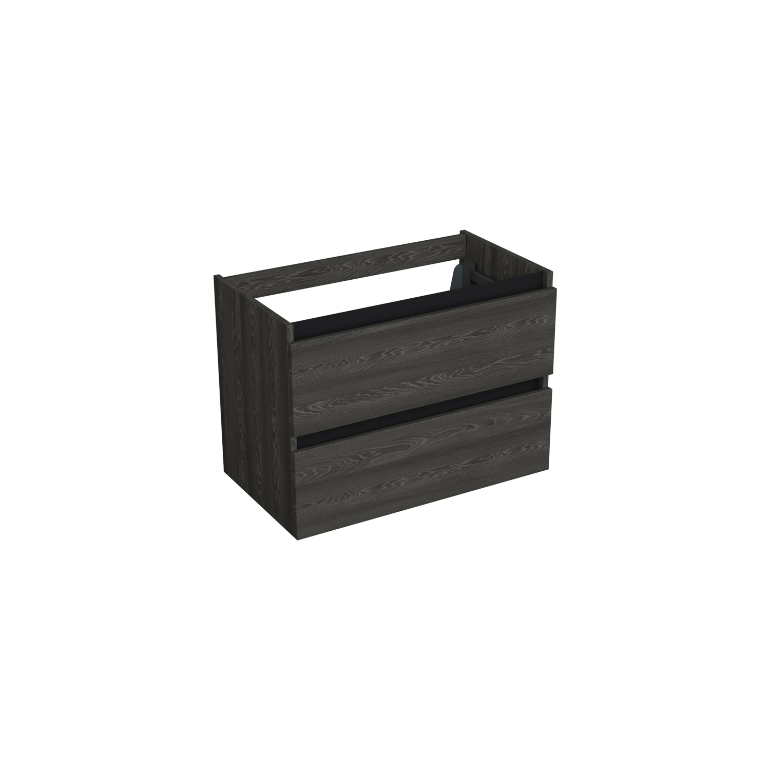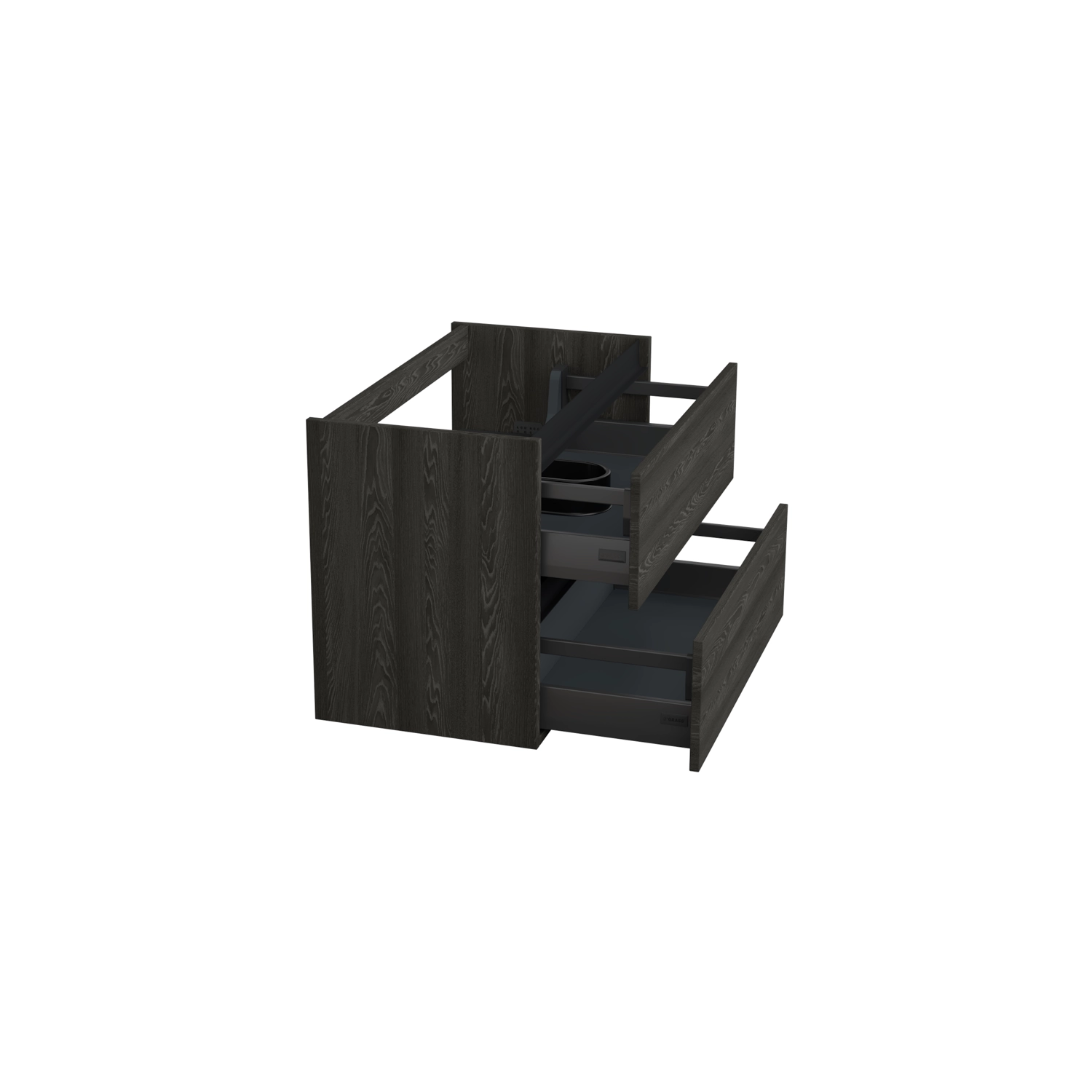 ✓ Onderkast 79 x 45 x 58 cm ❌ Excl. Wastafel ✓ Kleur: Zwart Eiken ✓ Twee diepe Modern, greeploos lades met sifon uitsparing ✓ MDF met FSC-keurmerk ✓ Installatie: Voorgemonteerd