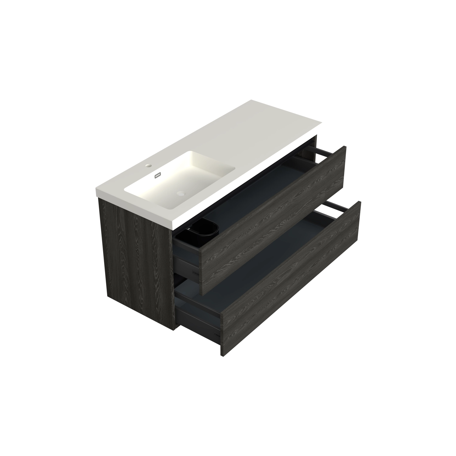 ✓ Onderkast 119 x 45 x 58 cm ❌ Excl. Wastafel ✓ Kleur: Zwart Eiken ✓ Twee diepe Modern, 2x greeploos lades met 1 sifon uitsparing - LINKS ✓ MDF met FSC-keurmerk ✓ Installatie: Voorgemonteerd
