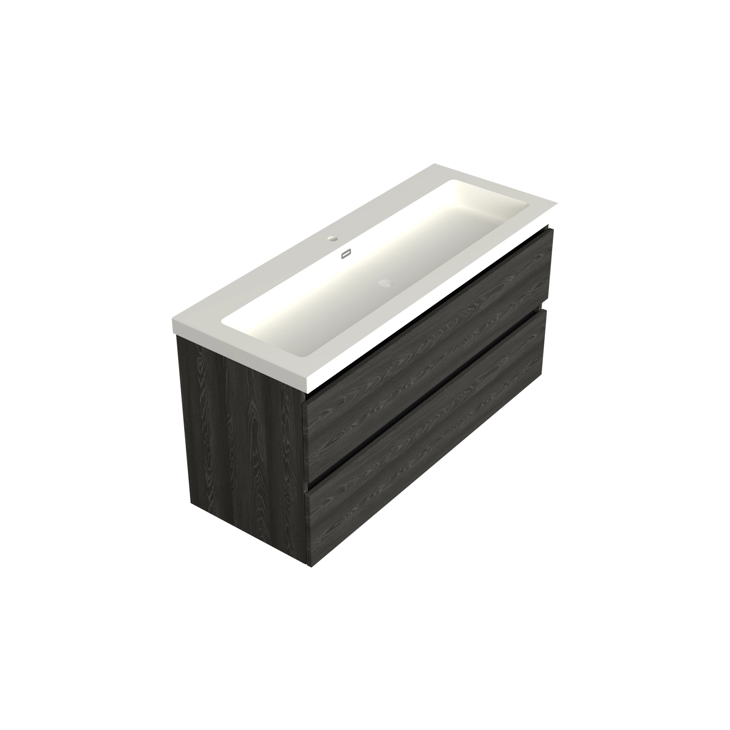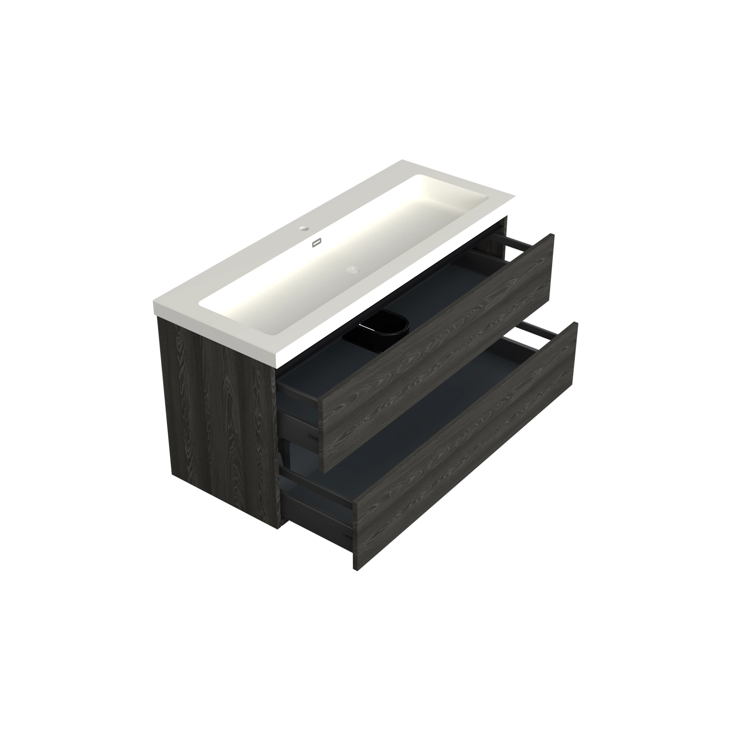 ✓ Onderkast 119 x 45 x 58 cm ❌ Excl. Wastafel ✓ Kleur: Zwart Eiken ✓ Twee diepe Modern, 2x greeploos lades met 1 sifon uitsparing in het midden ✓ MDF met FSC-keurmerk ✓ Installatie: Voorgemonteerd