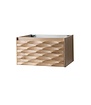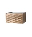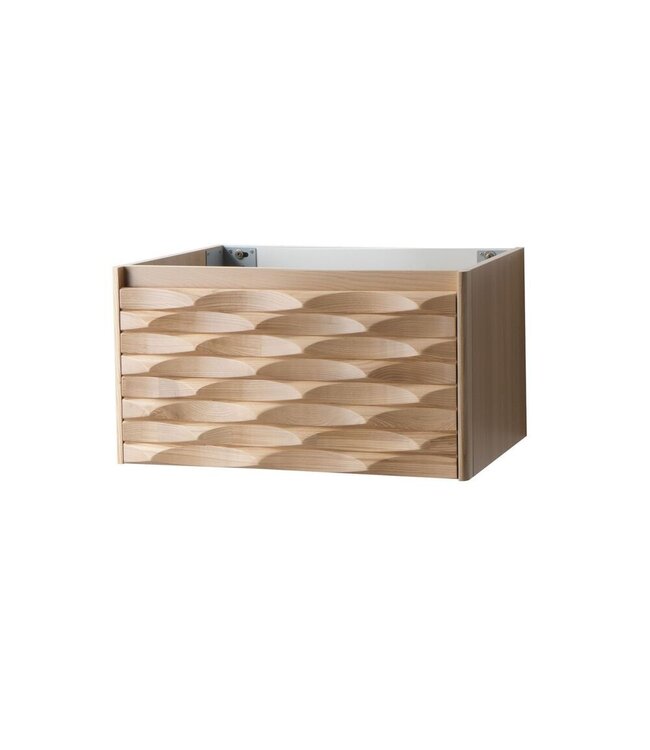 De wastafelkast is voorzien van één extra diepe lade met dubbele uitsparingen, perfect afgestemd op alle gangbare sifons. Dankzij Hettich softclose scharnieren met push- en pull-functie sluit de lade geruisloos en soepel. De voelbare, massieve motief met horizontale golven geeft het meubel een unieke textuur en een warme uitstraling.