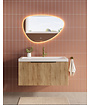 De Ribella onderkast wastafel is uitgerust met een softclose lade, afgewerkt met een subtiele zwarte greep. De lade front heeft een prachtige geribbelde structuur die de natuurlijke eiken kleur accentueert. Binnenin vindt u een handige sifon uitsparing, waardoor de ruimte efficiënt wordt benut zonder in te boeten aan opberggemak.