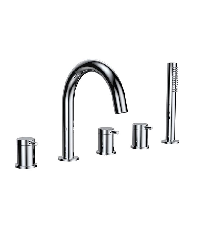 De Caral badkraan wordt geleverd als een complete set, inclusief aansluitslangen, verzonken handdouche, hoge baduitloop en een handige omstelknop. Dankzij de 5-gats configuratie biedt deze badkraan ultiem comfort en controle over uw badervaring. Met de keramische koud- en warmwaterbediening kunt u de watertemperatuur nauwkeurig regelen voor een perfecte relaxsessie in bad.