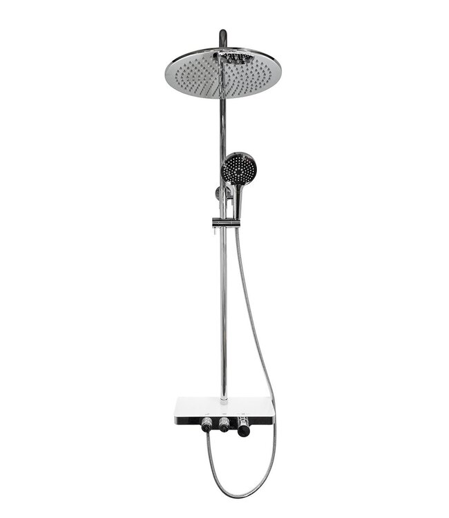 - Een start/stop functie een wit planchet van veiligheidsglas. Het planchet is 35 cm breed en 15 cm diep. Dit zorgt voor genoeg ruimte om je douchespullen op te leggen en zo heb je ze altijd binnen handbereik.